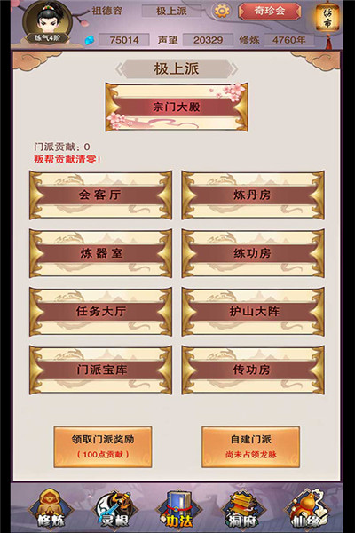 9、 新人门派问题:游戏有1-9级门派,初期进游戏别想高级门派,找个对应等级有镇派绝学的慢慢挂贡献兑换绝学。绝学加修为。练气期能进1星门派,筑基期能进12星门派,金丹期能进123星门派,元婴期能进234星门派,出窍期能进34星门派,5星门派需要分神期,6星门派需要洞虚期。然后叛门需要声望1级的100,2级的200,3级的400,4级的800。