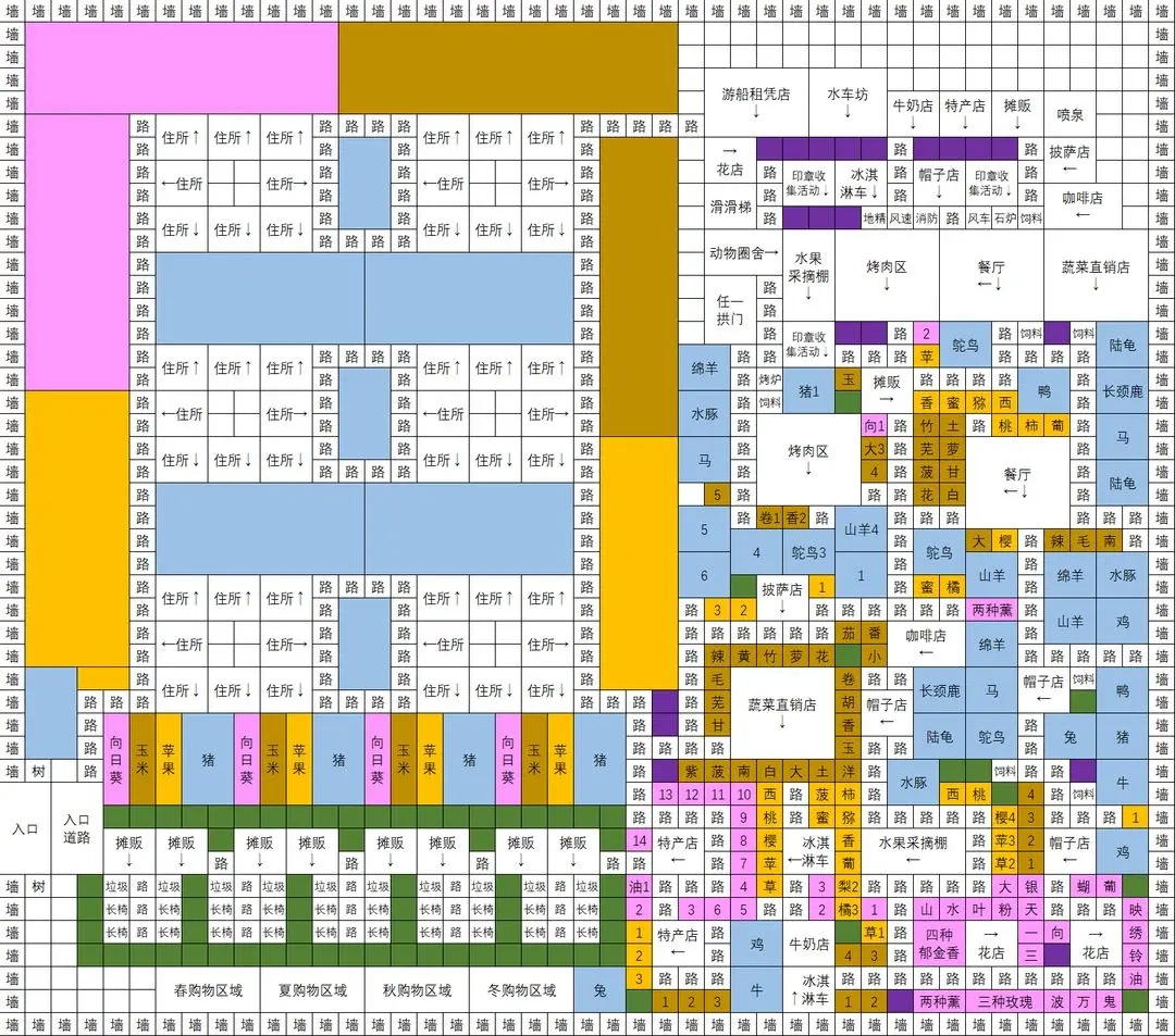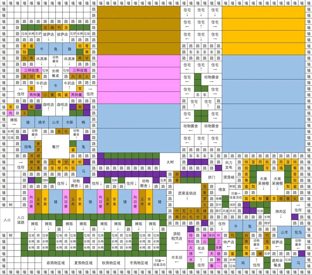 绿色背景的是加景色魅力的植物,粉色是花田,褐色是蔬菜,橙色是水果,蓝色是动物,灰色是任意一种培育物,紫色是设施或者植物。