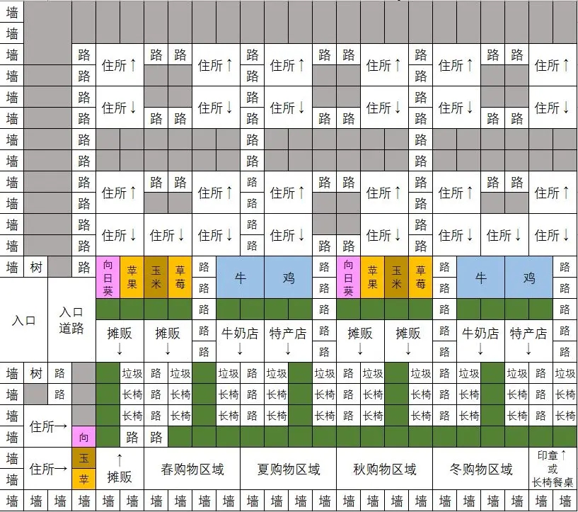 一周目存道具存钱布局:灰色背景是任意一种培育物,要过什么比赛就建什么培育物,或者平均分配都可以。植物不够可以随便放些东西上去代替。按布局建完之后就尽量过竞赛大赛,其他时候挂机