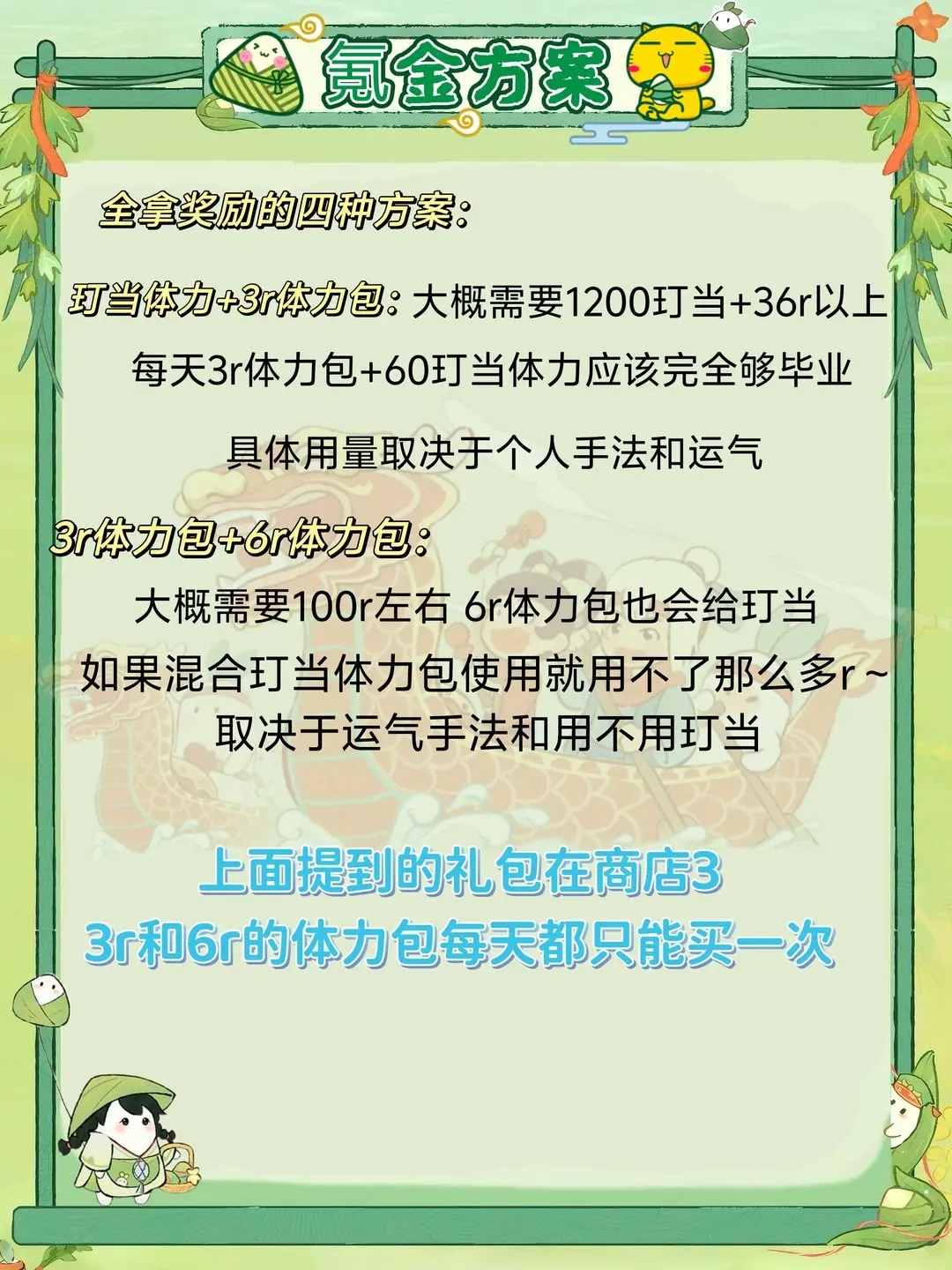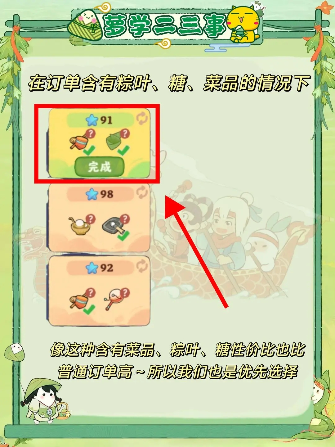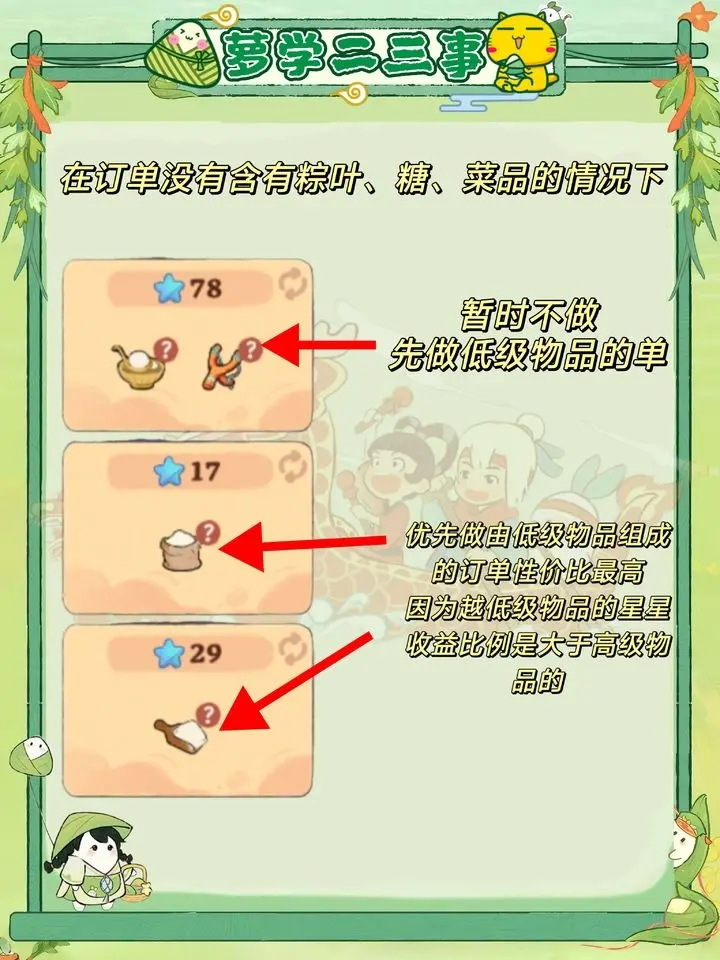 1.有效挑单可以减少体力的消耗,用较少的体力做性价比最高的单。简单来说就是优先做含有粽叶、糖和菜品的订单(粽叶和糖会随着游戏进度解锁工坊),没有这三种的情况下优先做低级物品组成的单。