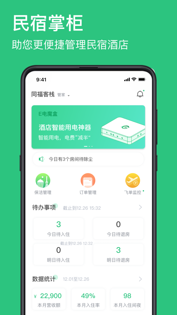 “民宿掌柜”APP,有别于传统的住宿业PMS系统,创新性地结合安装在房间的智慧用电物联网设备