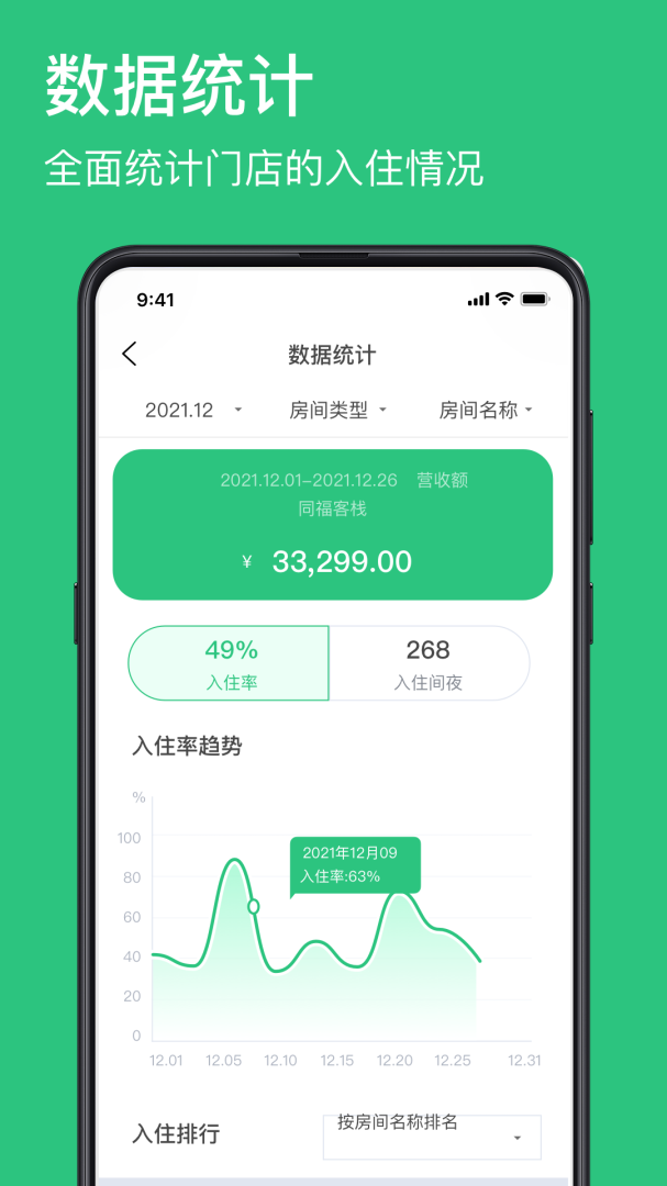 全面统计民宿内各个房间的入住情况,知晓业务具体数据。