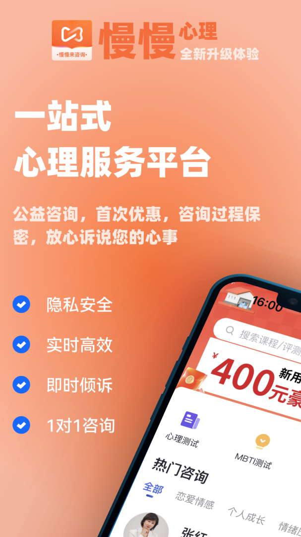 慢慢心理里的心理咨询是专业、多样、全面的,讲究对症解答,不会一概而论。除了心理问题,软件还支持解答各种人际关系,包括亲子、婚姻、职场等,帮助用户更好的生活