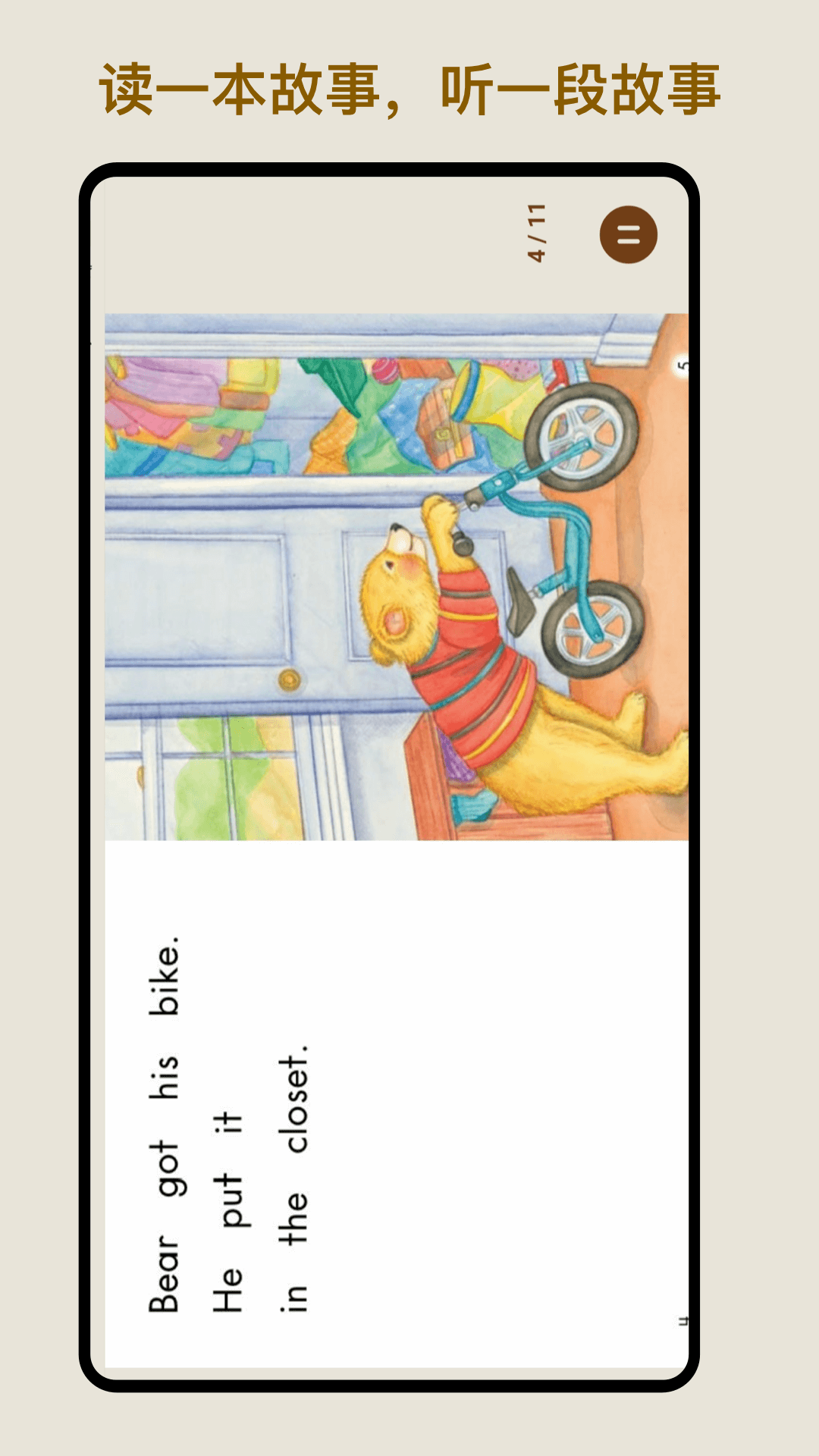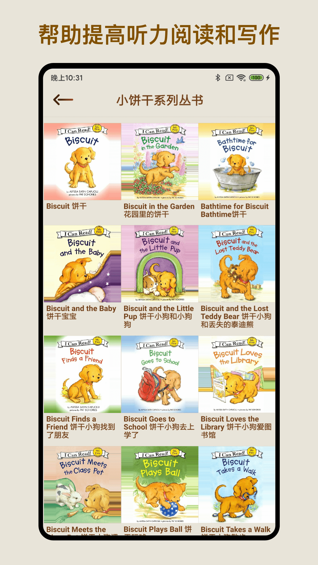 该软件为用户提供了超多优质的英语绘本故事内容,并且还有着有趣的配音,在这里孩子可以随时进行绘本的阅读,在阅读的过程中还能够进行英语的学习,帮助孩子从小就可以掌握更多的英语词汇,为今后的英语学习提供了很好的帮助