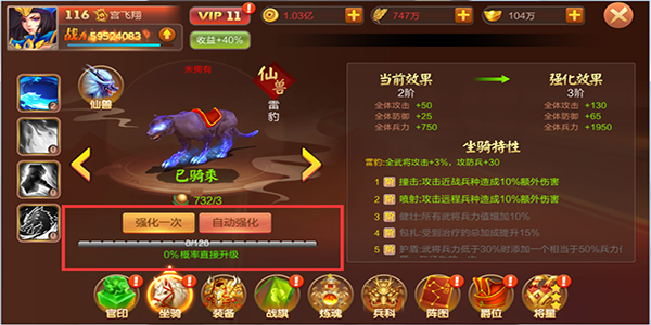 坐骑进阶,坐骑技能提升都可以提升战力,坐骑进阶需要消耗御兽丹,坐骑技能升级需要仙草,御兽丹,仙草道具可在太平环境及充值活动获得!