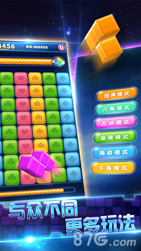 5、经典模式,糖果模式,拖动模式,方块模式 ,精彩的闯关模式多种创意道具组合,每个方块都充满意外