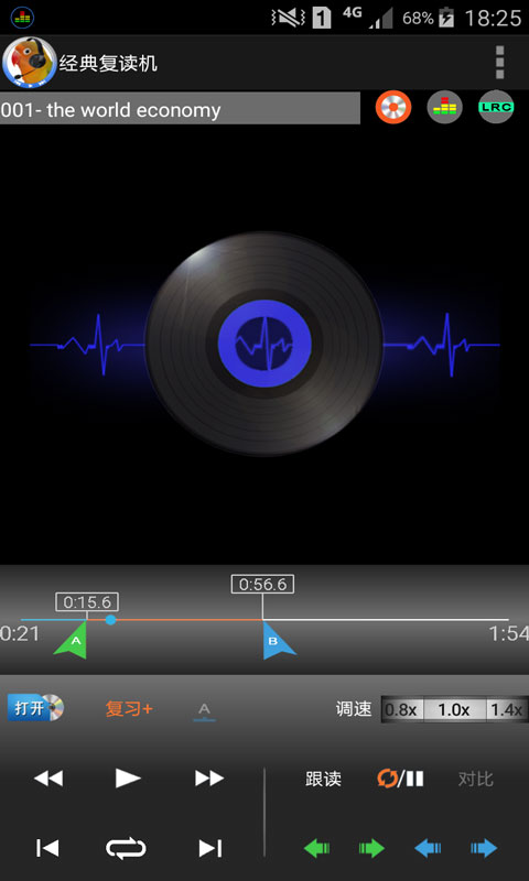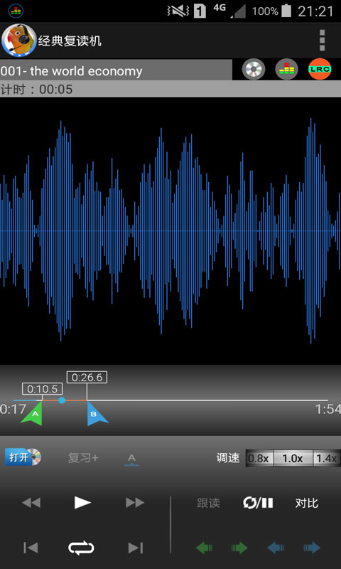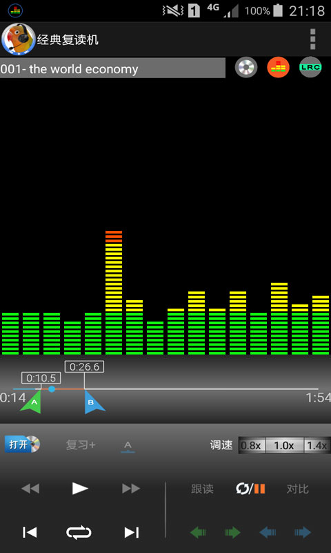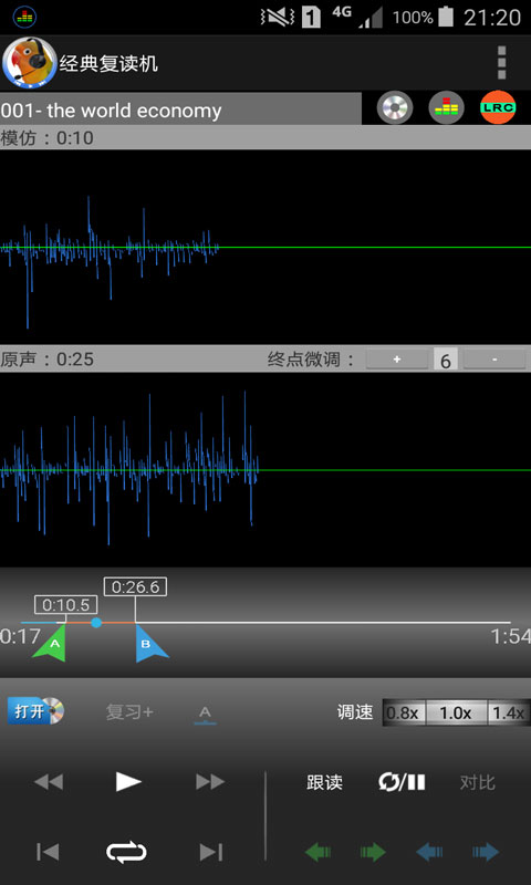 具备传统磁带复读机的复读/暂停、跟读、变速、对比功能。