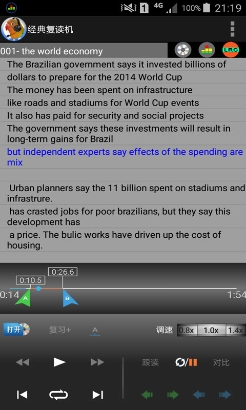 具备复习功能:你可以收集你感兴趣的句子存放到复习列表中,方便以后复习。在复习模式下,你可以选择很多来自不同歌曲的句子来播放,每一句会重复播放直到你按下Next按钮,对于重要的句子,你可以降低播放速度和模仿它的发声直到真正学会它。
