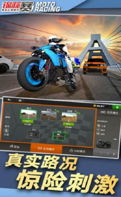 2、继承传统摩托车赛车游戏简单暴力玩法的同时,同时加入了职业模式、无尽模式和限时模式