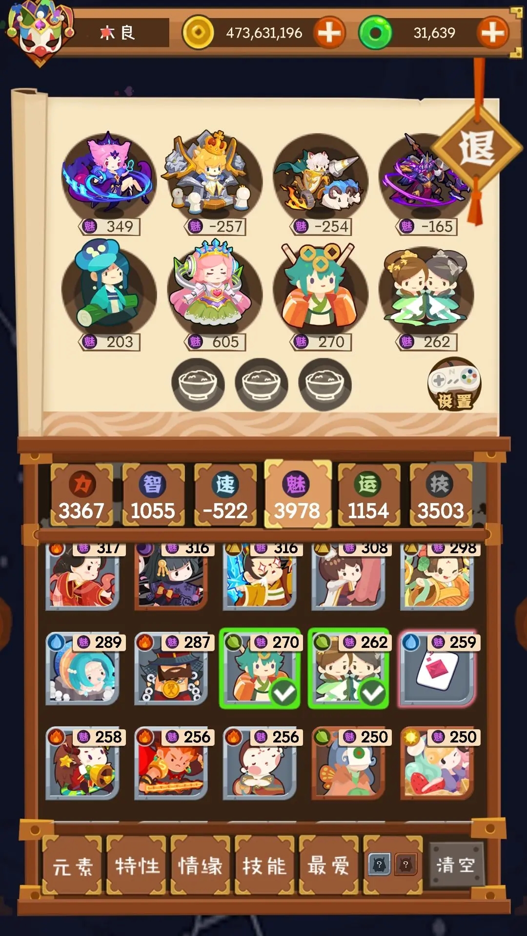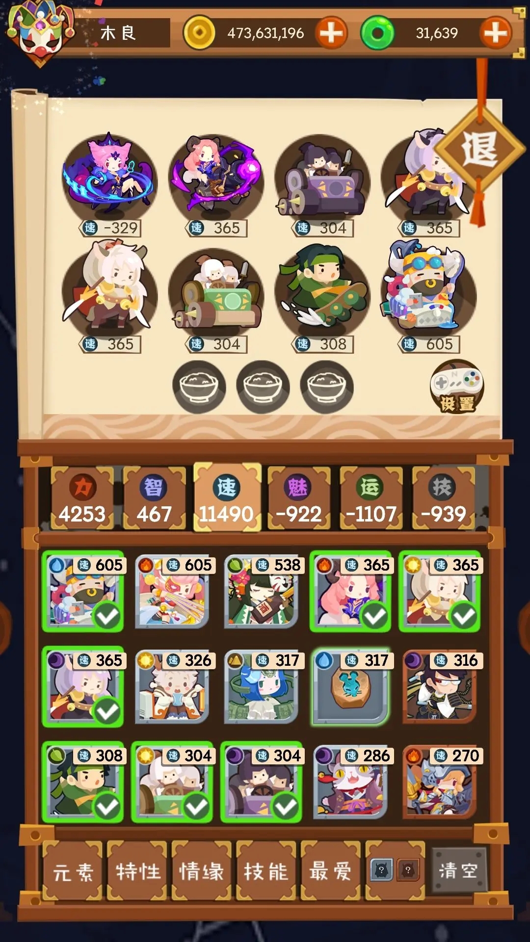 和第一个思路一样,把速度倒数的四个安排上,因为第三个给木属性加的魅力多,安排上四个木属性魅力的就够了