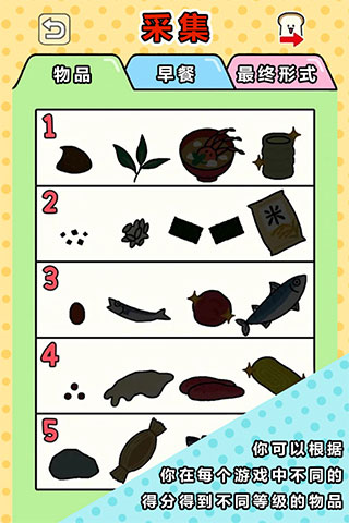 游戏中玩家可以通过完成各种有趣的小游戏来获得食材,根据你游戏的成绩不同,所获得的食材也不同,利用食材可以制作出美味的食物。