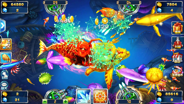 万人同时在线,四人同屏捕鱼,一起挑战大boss!黄金龙王、远古冰龙、神兽朱雀,让你做个真正的捕鱼达人。