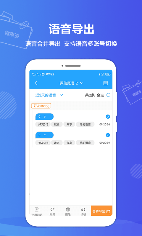 微痕迹是一款便捷管理聊天工具内的各类文件的手机应用。使用微痕迹可以实现对聊天工具中的图片、视频、语音以及各类文件进行导出、删除等一些系列操作!