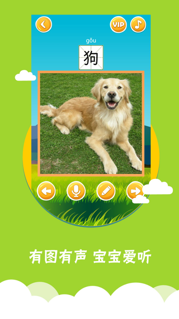 专为学龄前宝宝设计,采用看图识字的方式带领宝宝学习汉字,拼音,英语,写字等。软件通过真实的配图,有趣的声音,配以单词朗读发音学习常见的水果、蔬菜、动物、运动、交通、鸟类、天气、家电、文具、服装等数十个大类,宝宝不仅学习了汉字,也认识了世界,开发了大脑。