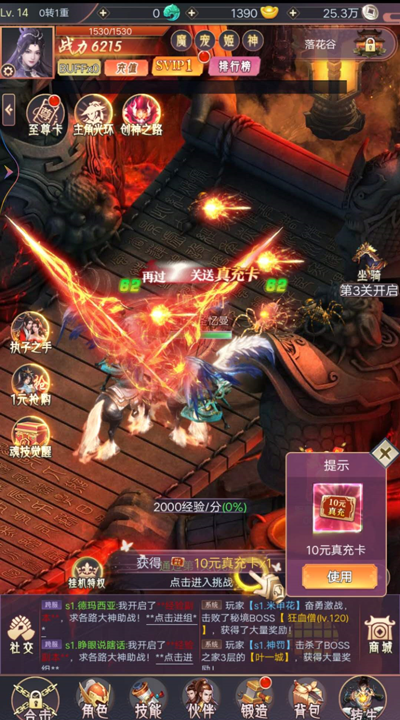 通关关卡越高挂机经验收益越高,前期尽量速升,把挂机收益提上去。如果买了主角光环,相隔20关会送12元真充卡,然后额外再送18元真充卡(3个6元真充卡),这个是很赚的,这真充卡是可以参与累充活动和VIP经验的,所以建议速刷,然后存在用在累充活动和升VIP等级上。