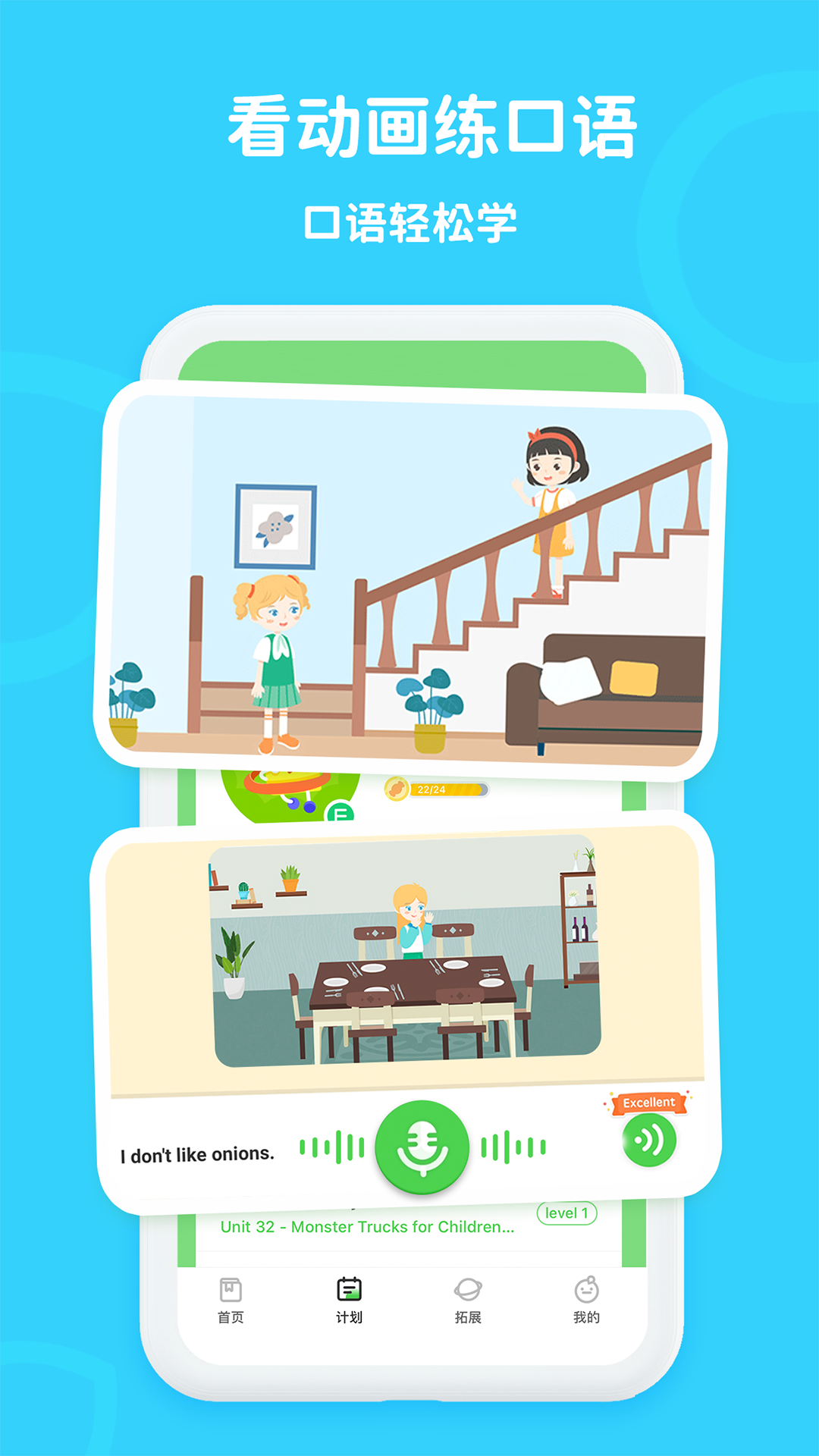 在这里可以看动画练习口语,还有学习积分累计,随时兑换好礼,拥有科学进阶式内容,还有游戏化趣味学习。该软件里面的知识点都是精选的,帮助用户通过多种方式来学习练习英语口语,提升口述能力,需要伙伴,安装使用哦
