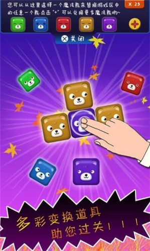 小熊作为唯一的主角带着你开启消除的步伐哦!游戏中毫无时间限制,你想怎们玩就怎么玩,轻松有趣