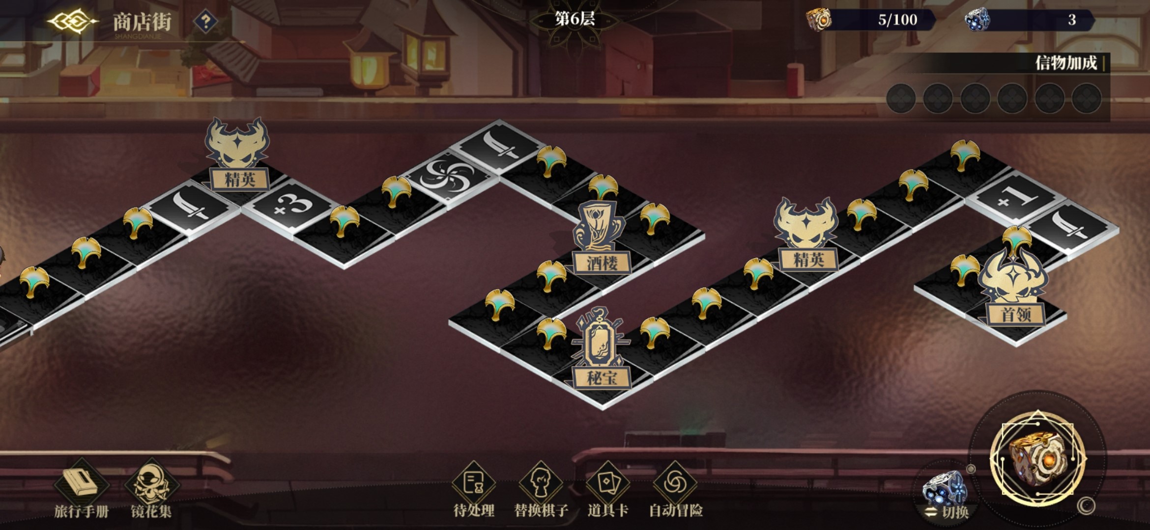 ③商人节点中,概率出售打折镜心,尽量使用天像骰多走商人节点,增加概率;也可以购买月银螈,灵器经验等一些养成资源。