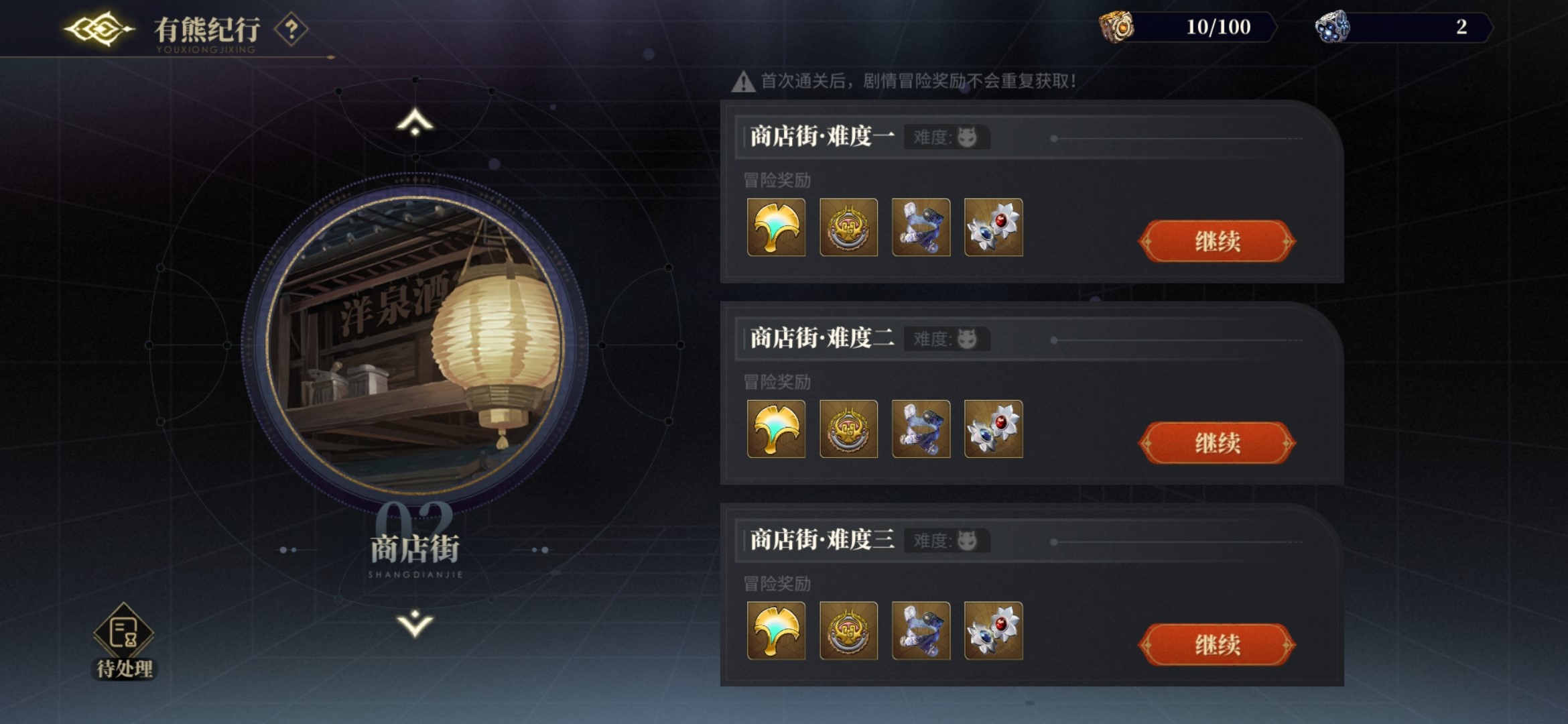 重复关:分为3个关卡,随着主线剧情的推进开放,每个重复关卡可以分为3个难度,每个难度通关一层之后,开启下一难度,奖励随难题提升而提升;不同关卡获取不同的信物。