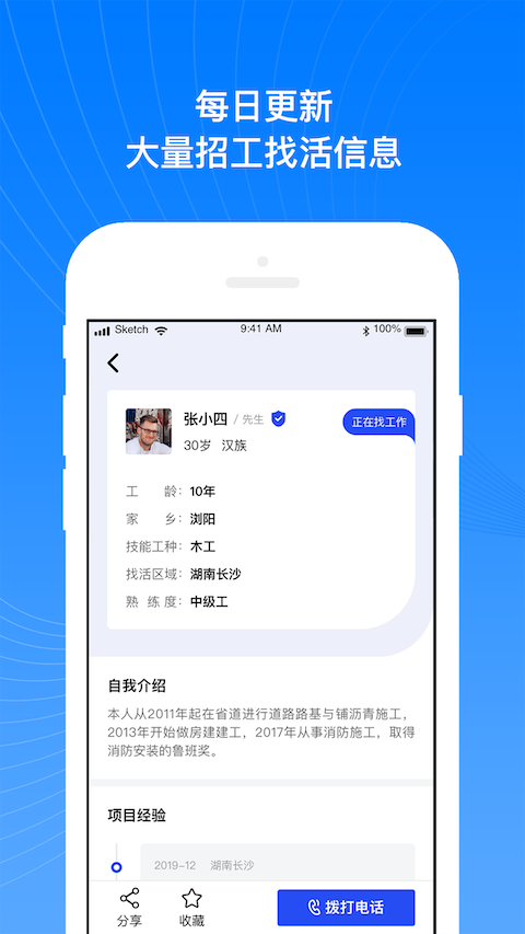 打造的是非常智能便捷的服务平台,建筑工人可以使用软件找活的,这里提供的是非常优质的建筑工活,都是经过考核的,大家是可以放心在线查找的。汇聚的是超多的工友,可以随时在线进行互动的
