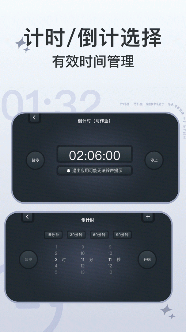 高效的时间管理工具.可以让使用者专注于当前目标,有效提升目标任务完成效率.广泛适用于学习、工作、运动、冥想、读书、小睡等所有需要便捷计时的场景.