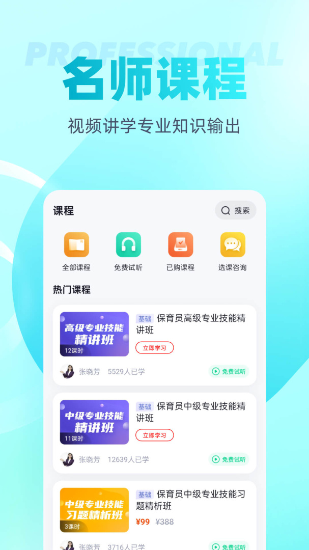 保育员考试聚题库适用于幼儿园保育员的资格考试平台,有非常多的课程和资料,而且所有的资源都会不断的更新,用户可以在线模拟考试,轻松掌握各种类型的知识点,能够让你轻松通过考试,平台有多种学习方法,用户可以根据自己的喜好选择,而且随时都可以在线模拟测试。