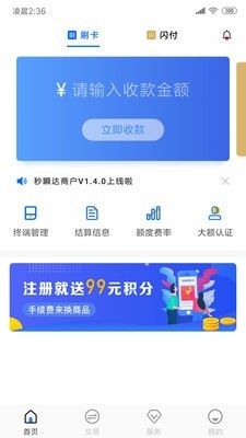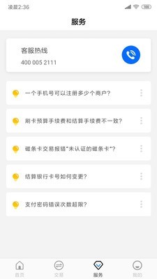 主要功能:POS收款、交易结算查询、额度费率查询、终端绑定、磁条卡大额认证、变更结算卡等服务;