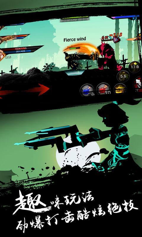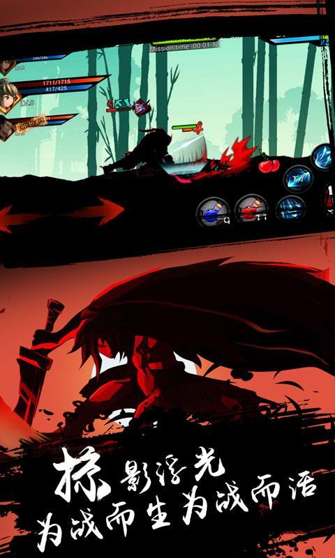 游戏采用独特的剪影画风设计,操作非常流畅,三大角色选择,每个角色都有自己独特的技能,刀光剑影中一展格斗魅力,还有各种连招释放,值得一试哦