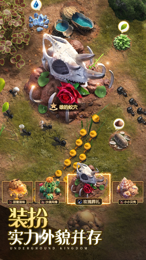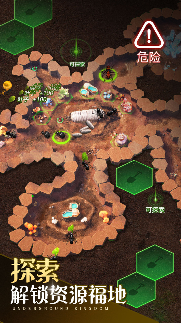 游戏以动物世界为主背景,大家可以在游戏中开启自己的蚂蚁帝国,利用蚂蚁的团结来收集资源,进行战斗、觅食、建造,开启属于你的称霸时代