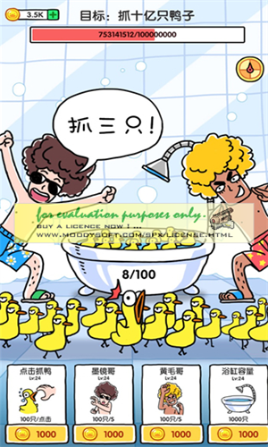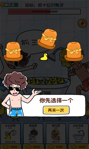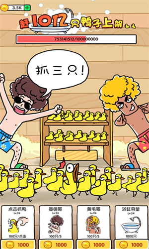 抓10亿只鸭子这款休闲游戏采用了精致的卡通风格来设计,将整个游戏画面都变得非常明亮,给玩家一种十分舒适的感受,在游戏中玩家需要控制屏幕中的几个角色去抓鸭子,操作十分简单基本新手玩家也能够迅速上手,不过有些鸭子为了不被抓住它会在身上涂满液体,使自己变得很难被抓起来,这时候玩家就可以借助道具来将它捕获