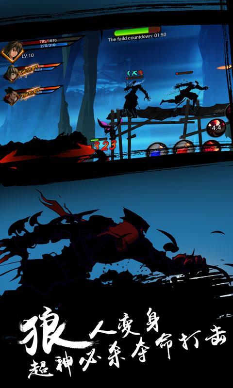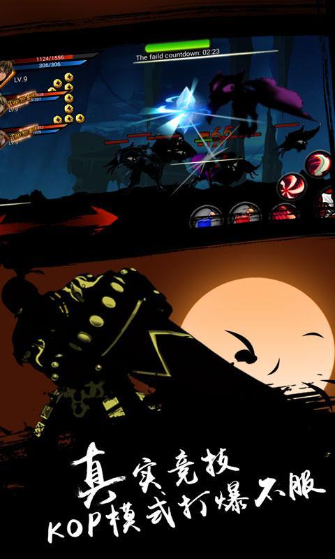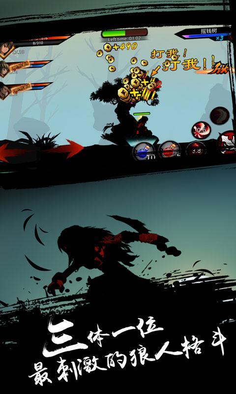 游戏采用独特的剪影画风设计,操作非常流畅,三大角色选择,每个角色都有自己独特的技能,刀光剑影中一展格斗魅力,还有各种连招释放