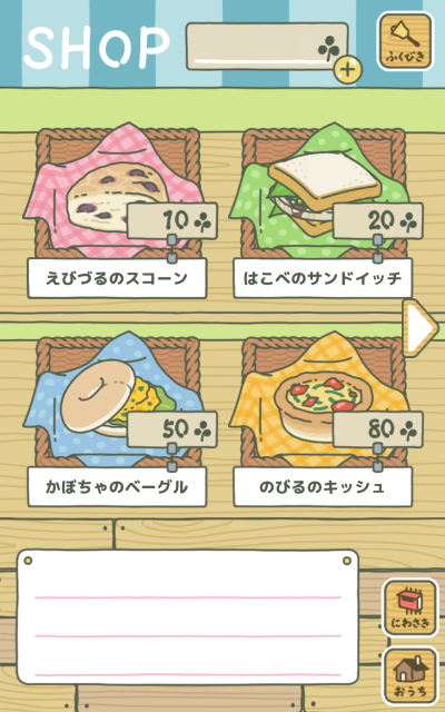 玩家在这个游戏里大多数时间处于 " 无所事事 " 状态,我们每隔一段时间开游戏看看,屋外的幸运草长满了就去拔一拔,收获的幸运草可以拿来购买各种便当、碗具、水壶、灯笼等道具,这些都是可以给小青蛙出门带着的。小青蛙的包袱里一般放便当、护身符、道具。便当就不用说了,路上的口粮,护身符是保佑出行平安的,道具可以是水壶、碗器、灯笼等等实用的东西,这些东西越好,小青蛙就可以走得越远,看到更多的风景。