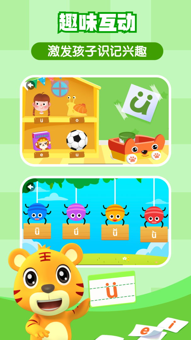 3、形式活泼:有别于传统的拼音教学,我们将课程和互动游戏巧妙地结合起来,让孩子在玩耍的过程中,不知不觉完成拼音启蒙