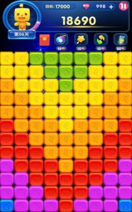操作相当简单,通过滑动屏幕让许多相同的方块连接在一起进行消除,消除方块越多,获得的奖励就会越多,同时如果一次性消除5~10块方块,就能够获得一些非常强有力的道具,这些道具能够帮助用户消除周围的一些方块