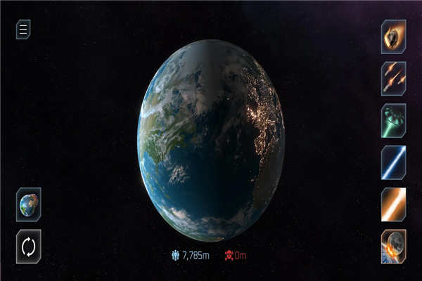 游戏中行星也是可以升级的,你的武器也是可以升级的,升级行星之后你的行星将会变得更耐打,毁灭的过程也会十分的漫长,体验刺激的攻击的,轮番毁灭个遍,游戏的特效和画面也十分的出色,给你带来真正的毁灭体验,而且游戏中你还自定义的毁灭哪个点,在行星上画上一个巨大的图案,乐趣十足。而且还有现有人口和死亡人口,体验毁灭带来的人口锐减吧。