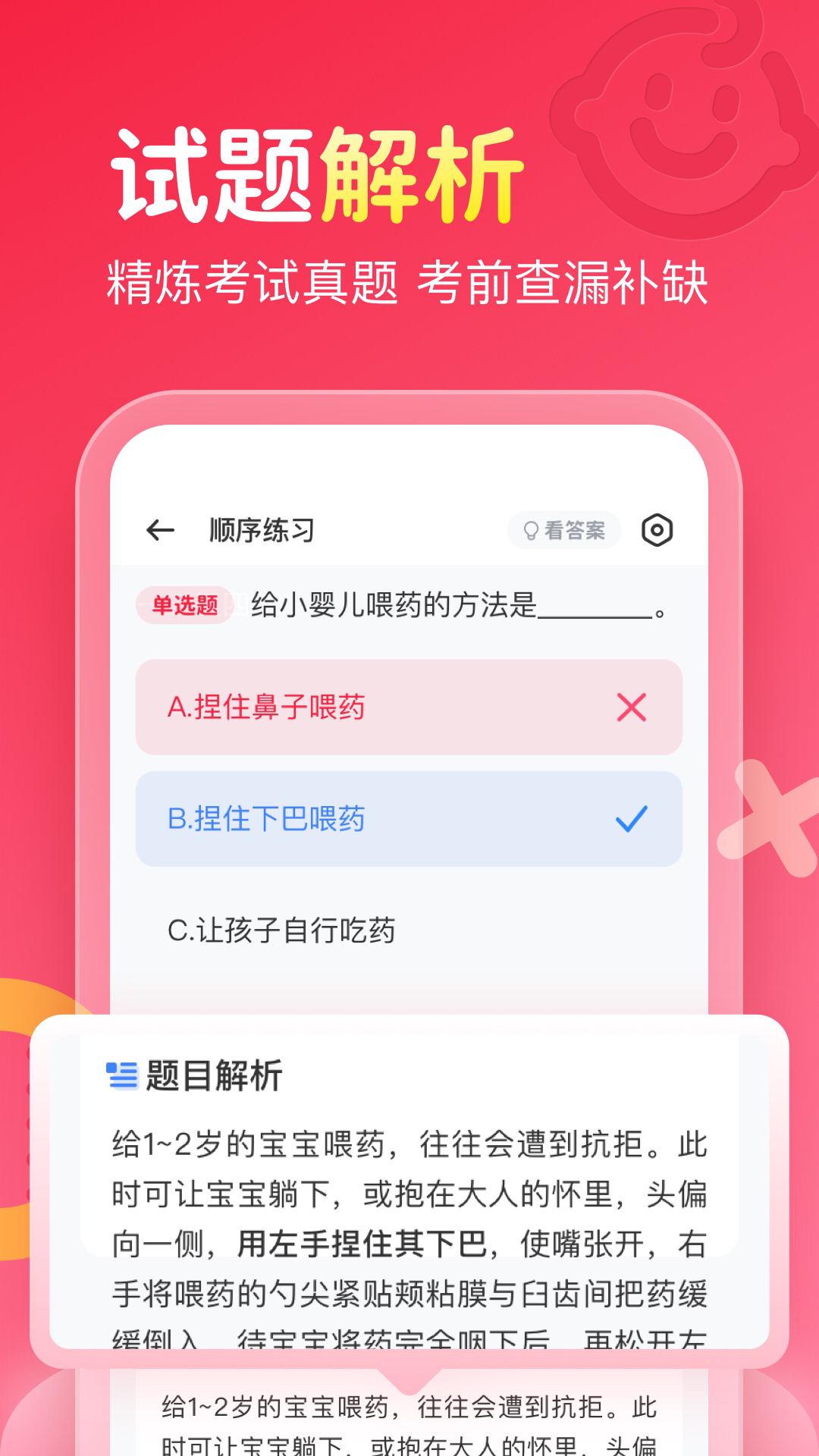 精炼考试真题,考前查漏补缺,丰富的题库内容,用户可以在保育员考试宝典每天进行练习,巩固知识点