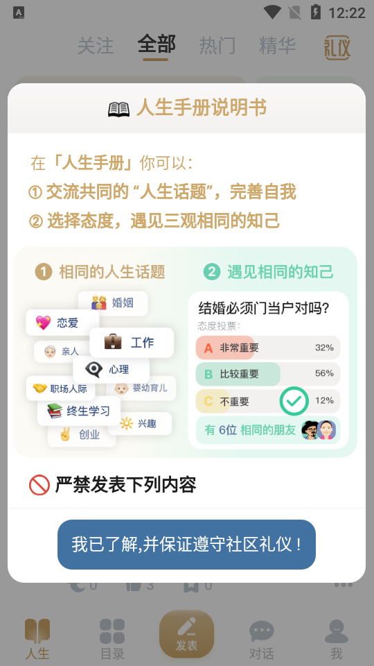 2、通过人生话题,表达交流观点,选择态度,展现三观,这样便可以直观的发现与自己“三观相同”的人