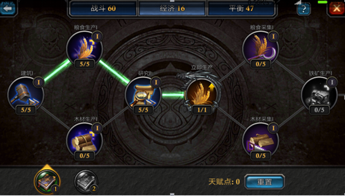 平衡天赋的加点,平衡天赋在发展过程中起着很大作用,因为它在发育时对各个建筑的属性加成包括医院容量、训练速度和其他很多地方都有加速和提升。这个加点也建议全部往后面加。加点稍微复杂的就是战斗天赋的加成,一点大家记得注意使用天赋技能,比如使用立即生产立马从城里田中收取五小时采集量,使用三秒回兵坑打你的人这些都是很实用的技能。