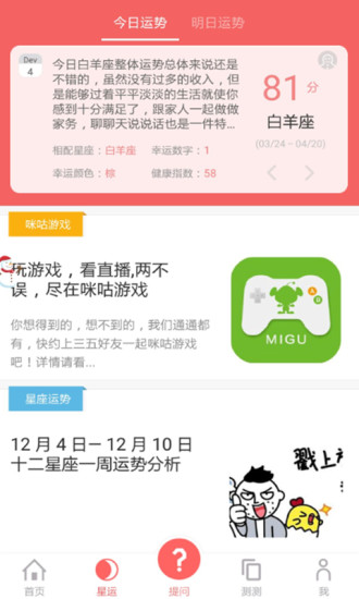 星座游戏大全是星座爱好者喜欢的星座资讯阅读应用,你可以在这里了解最新的星座资讯信息,计算最新的运势,更有心理测试了解你内心的声音哦!你有兴趣吗?有的话,就赶紧来看看吧!赶紧加入星座游戏大全吧