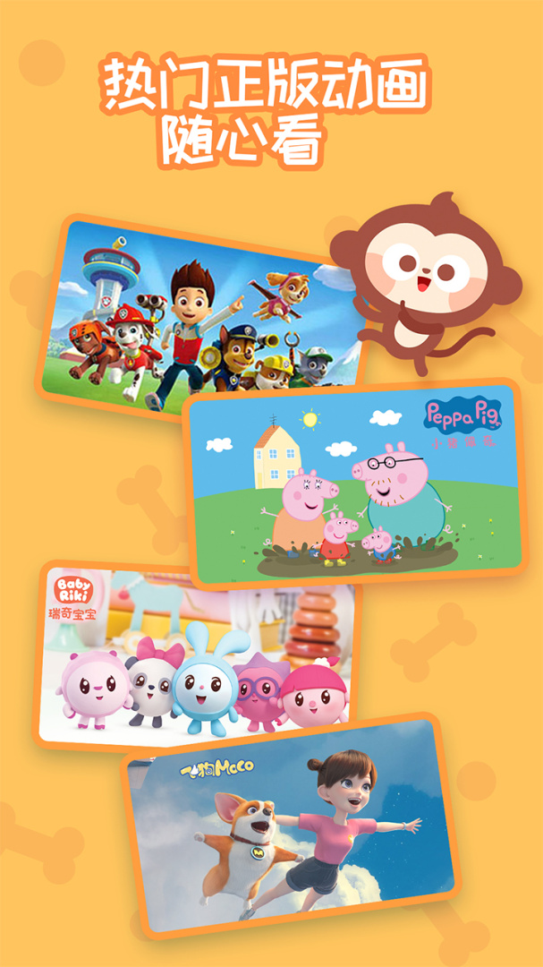3、还收录了海量宝宝喜爱的热门动画片:小猪佩奇、汪汪队、喜羊羊与灰太狼、倒霉熊、超级飞侠、兔小贝、啵乐乐、可可小爱、海底小纵队、瑞奇宝宝、太友和萌鸡小队……等等,超多小朋友喜爱的动画明星都在这里聚集,可爱萌趣的卡通形象陪宝宝一起度过快乐的童年