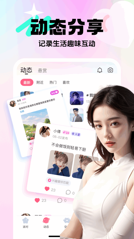 享聊,一款目前火热流行的视频交友、语音交友、游戏互动交友APP,可以组情侣CP,还可以根据兴趣爱好性格匹配让你心动、与你相搭的那个她(他)。