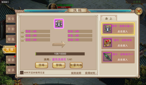 装备洗炼只有紫色及紫色品质以上,并且穿戴在身上的装备才能进行洗炼。洗炼时会随机产生3条属性,橙色装备可以洗出4条属性,玩家可以将自己想要保留的属性锁定,锁定后不会被替换掉。