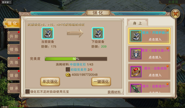 小提示:装备强化需要消耗对应的强化石,高级的强化石也可以通过将多余的低级的强化石合成获得。强化石可以通过商城购买或者是断魂桥获得哦。玩家还可以使用强化完美符一次性将强化进度至100%哦。