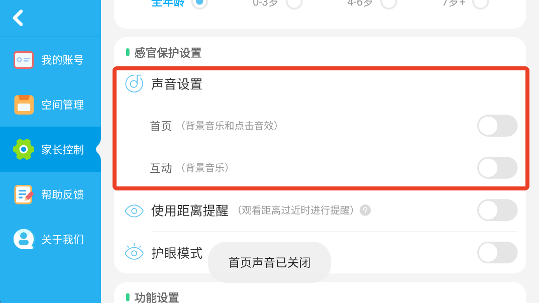 4、在这里我们可以关闭首页的背景音乐和点击音效,以及互动的背景音乐。