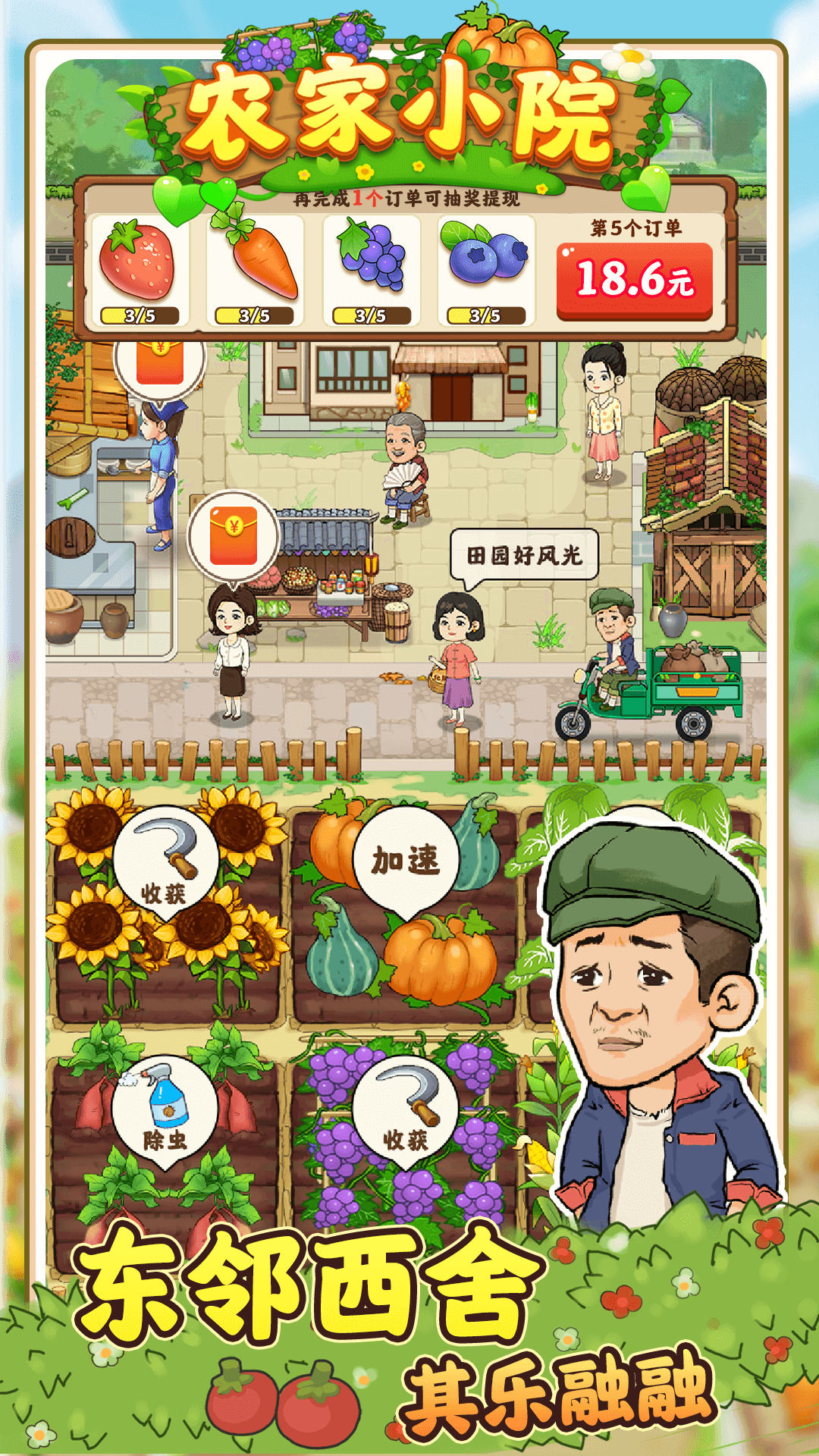 轻松舒适玩法,收集多多的资源,放置自己的农院获得多多奖励