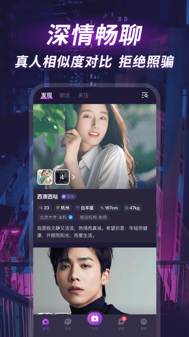 深聊是一款智能交友综合平台,为用户提供全面的社交体验,通过深聊,你可以与来自世界各地的新朋友进行有趣的对话,不仅可以文字聊天,还可以发送语音、图片和视频,让沟通更加生动,深聊还提供了实时翻译功能,突破语言障碍,让跨国交流变得轻松自如,深聊还设有多个话题讨论群组,以及面向不同兴趣爱好的社区,让用户更易于结识志同道合的人,隐私与安全也是深聊重视的核心,用户信息均经过严密保护。