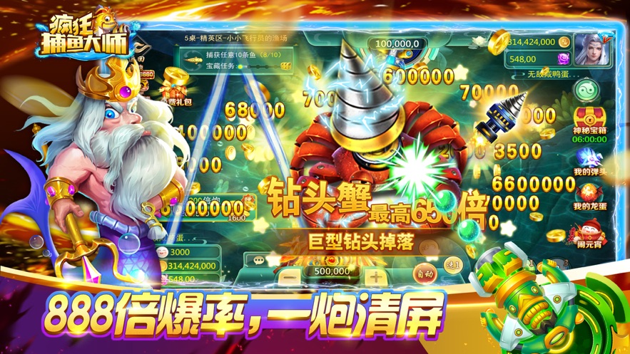 超级boss,全民击杀,10亿奖池,轻松获得,不用再担心游戏币不够,体验不够爽了,让你一次爽翻天,成为超级捕鱼大咖!