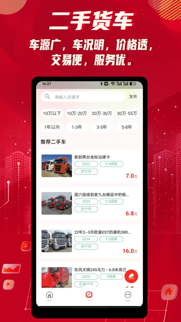 为用户提供干净的货运平台、找车、找货、发物流、定制挂车、选货车、买货车、用货车、二手货车、二手挂车等所有环节准确、做货车人真正快捷的一站式服务