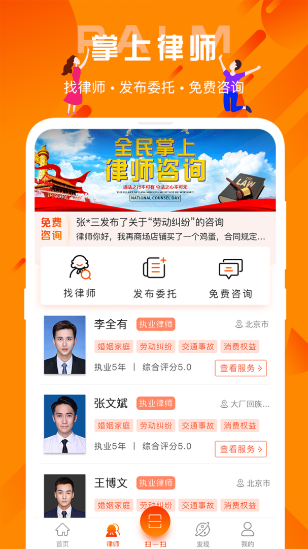 2、律师:找律师,发布委托,免费咨询