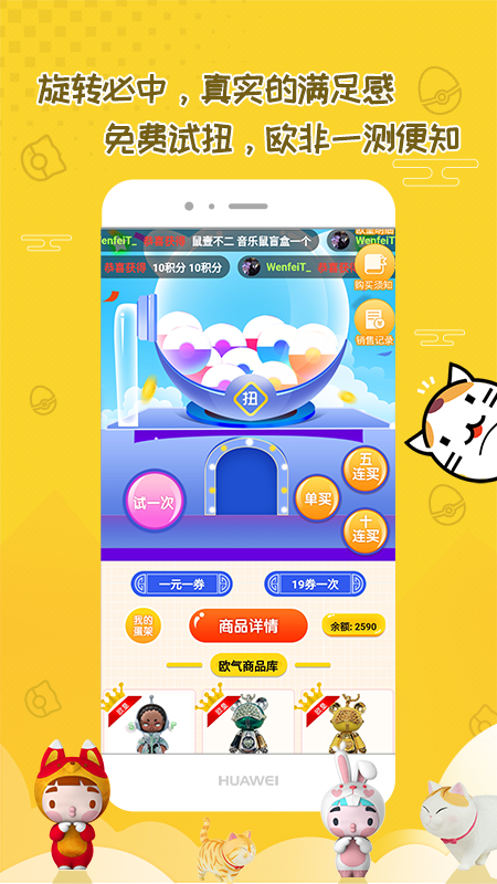 其实就是一个娃娃机,不过不同的是在手机上抓娃娃,而这些娃娃就是二次元的二手,抓到的娃娃会在第一时间内送到你的手里。这里的娃娃每天都会进行更新,所有的盒子都是随机的,就要看你的运气能不能抽到自己喜欢的手办